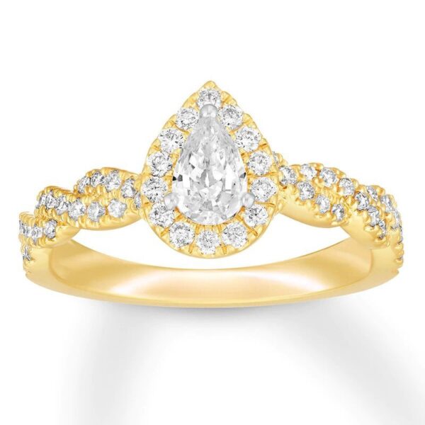 Collection, this glamorous engagement ring showcases a pear-shaped diamond, framed in round diamonds. Ribbons of round diamonds adorn the 14K yellow gold band for a total diamond weight of 3/4 carat.